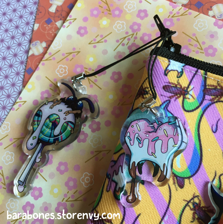 These clear acrylic charms measure 4 and 6cm long, and have glitter epoxy on the printed side. The other side has a plastic removable protective sheet.