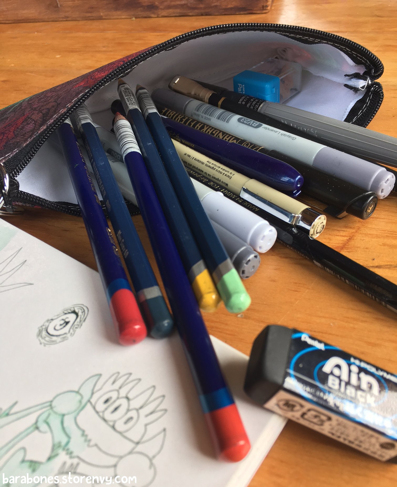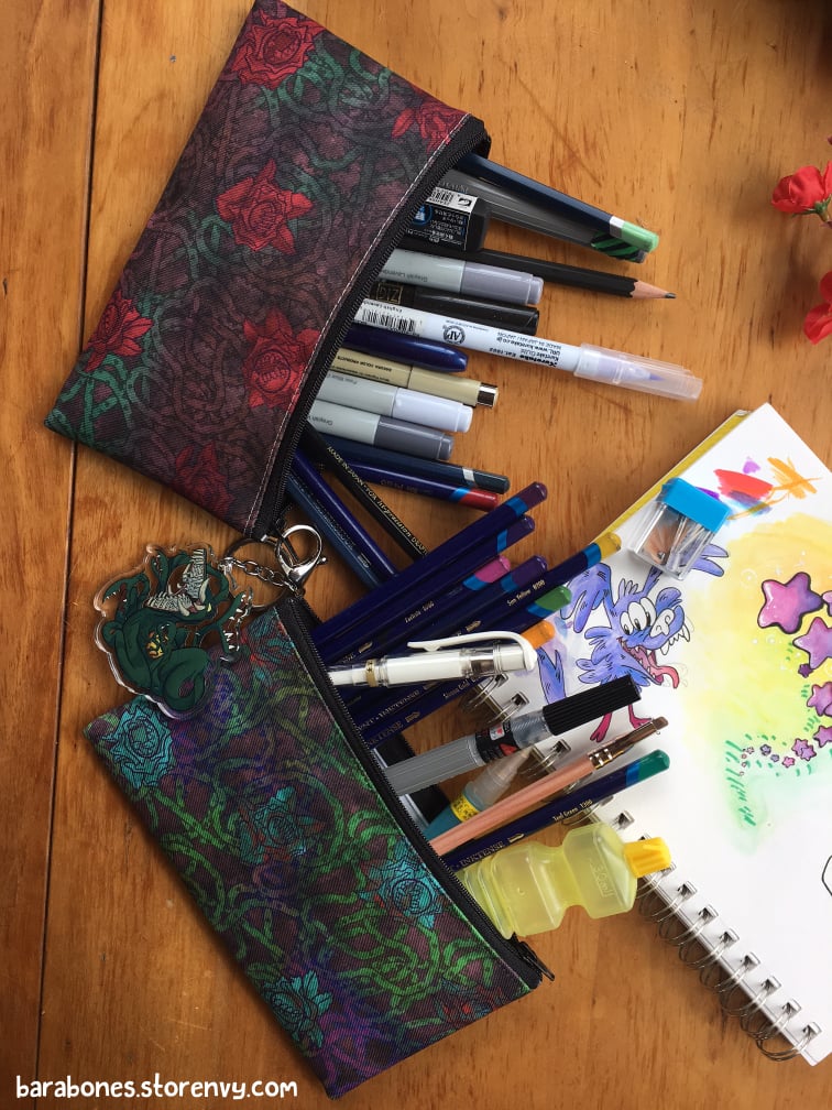 A design consisting of an overgrown mass of twisting rose vines, and buds sporting worrying sets of chompers. These bags are ready to keep any matter of pencils, markers, and other goodies safe from harm.