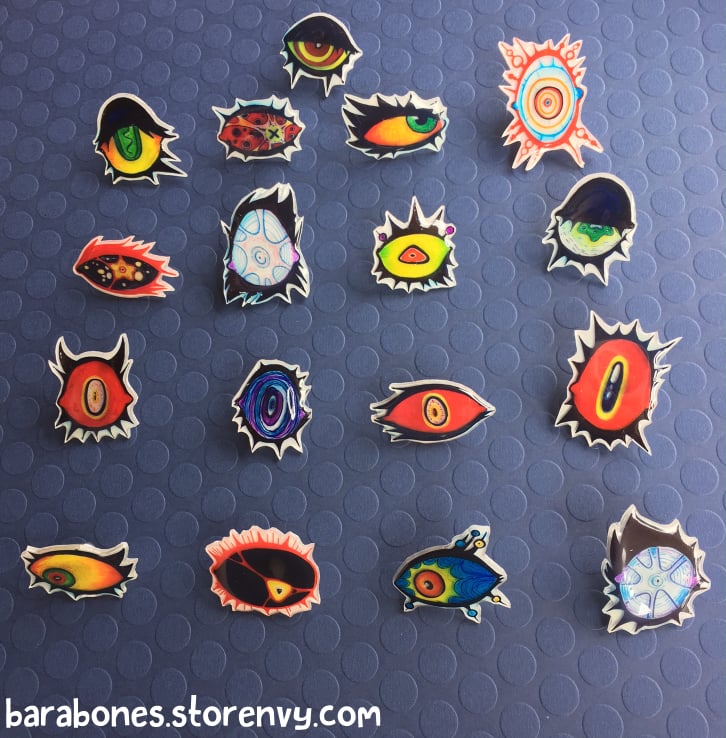Curse your friends, and your enemies with these evil eyes! Potent evil energy distilled and crafted into a colorful, convenient, and wearable form! Each is crafted by hand, so no two are truly alike. They work fantastically in pairs or even trios!